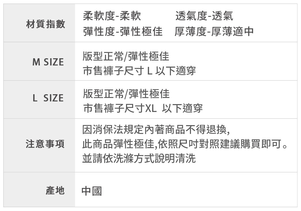褲身材質 : 69% 尼龍、31% 彈性纖維 褲底材質 : 90% 木漿纖維、5% 蠶絲、5% 彈性纖維